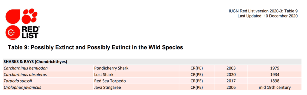 One species of shark (Carcharhinus obsoletus), which was only formally described in 2019, enters the Red List as Critically Endangered (Possibly Extinct) since its most recent record dates back to 1934. Nevertheless, further research is required.