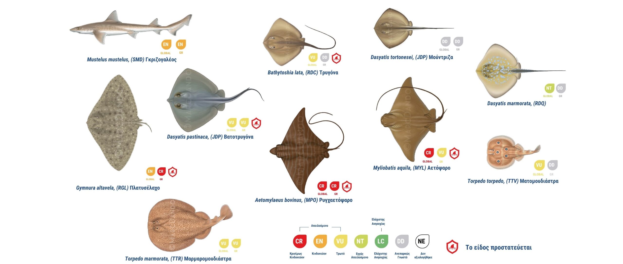 Εντός των ορίων του Εθνικού Πάρκου Υγροτόπων Αμβρακικού μέσα από τη συστηματική παρακολούθηση της αλιείας και τις δράσεις πεδίου της iSea που πραγματοποιούνται σε καθημερινή βάση, έχει τεκμηριωθεί η παρουσία 1 είδους καρχαρία και 10 ειδών σαλαχιών, με την πλειονότητά τους να είναι είδη υπο προστασία ή/και απειλούμενα με εξαφάνιση. Παρακάτω παρουσιάζονται τα είδη που εντοπίζονται στο Εθνικό Πάρκο Υγροτόπων Αμβρακικού