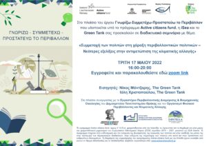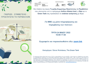 Στο πλαίσιο του έργου «Γνωρίζω-Συμμετέχω-Προστατεύω το Περιβάλλον», η iSea και το Green Tank σας προσκαλούν σε σεμινάριο κατάρτισης με θέμα: «Τα ΜΜΕ ως μέσα πληροφόρησης και παρέμβασης πολιτών» και στόχο την ενίσχυση της συμμετοχής των πολιτών στις δημόσιες συζητήσεις και στη λήψη αποφάσεων που αφορούν σε φλέγοντα περιβαλλοντικά ζητήματα. Read more “Πρόσκληση σε webinar κατάρτισης”