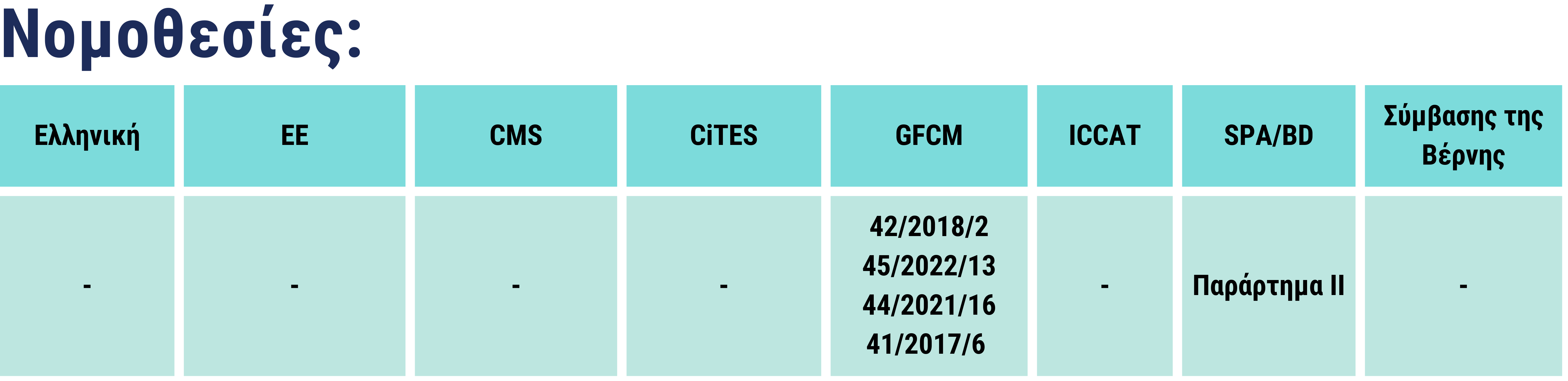 Κύριες Απειλές: Κατευθυνόμενη και παρεμπίπτουσα βιομηχανική και μικρής κλίμακας αλιεία με τη χρήση διαφόρων εργαλείων, όπως τράτες βυθού, απλάδια, βενθικά παραγάδια και μανωμένα δίχτυα.