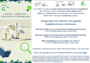 Στο πλαίσιο του έργου «Γνωρίζω-Συμμετέχω-Προστατεύω το Περιβάλλον», η iSea και το Green Tank σας προσκαλούν στον τελευταίο κύκλο διαδικτυακών σεμιναρίων «Συμμετοχή των πολιτών στη χάραξη περιβαλλοντικών πολιτικών» που έχει στόχο την ενημέρωση των συμμετεχόντων σχετικά με τις πρόσφατες πολιτικές εξελίξεις για την αντιμετώπιση ορισμένων εκ των πιο πιεστικών περιβαλλοντικών κρίσεων, αλλά και τα διαθέσιμα μέσα παρέμβασης και συνηγορίας, ώστε οι πολίτες να συμμετέχουν στη διαμόρφωση των πολιτικών. Read more