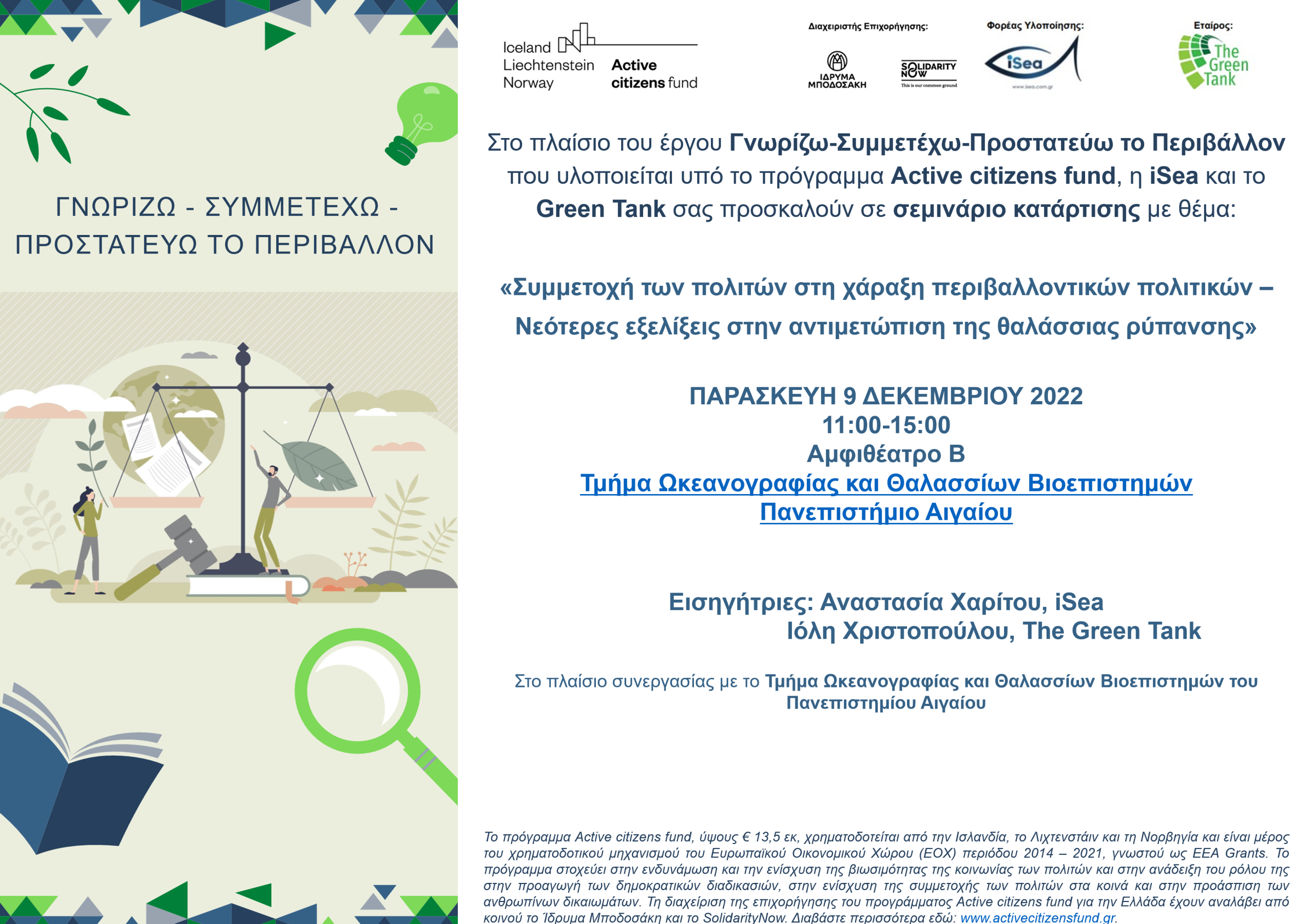 Η iSea και το Green Tank σε συνεργασία με το Εθνικό και Καποδιστριακό Πανεπιστήμιο Αθηνών, σας προσκαλούν σε σεμινάριο κατάρτισης με θέμα: «Συμμετοχή των πολιτών στη χάραξη περιβαλλοντικών πολιτικών – Νεότερες εξελίξεις στην αντιμετώπιση της θαλάσσιας ρύπανσης», την Πέμπτη 12 Ιανουαρίου 2023, 11:00-15:00 στο Αμφιθέατρο 9, στο Νέο Κτήριο Ν.Ο.Π.Ε.