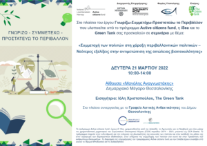 Στο πλαίσιο του έργου «Γνωρίζω-Συμμετέχω-Προστατεύω το Περιβάλλον», η iSea και το Green Tank σας προσκαλούν σε σεμινάριο κατάρτισης με θέμα: «Συμμετοχή των πολιτών στη χάραξη περιβαλλοντικών πολιτικών – Νεότερες εξελίξεις στην αντιμετώπιση της απώλειας της βιοποικιλότητας» και στόχο την ενίσχυση της συμμετοχής των πολιτών στις δημόσιες συζητήσεις και στη λήψη αποφάσεων που αφορούν σε φλέγοντα περιβαλλοντικά ζητήματα.