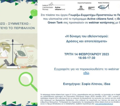/in NewsAs part of the “Know-Participate-Protect the Environment” project, iSea and The Green Tank invite you to a training seminar on “The power of volunteering: Actions and results” aimed at enhancing citizen participation in public debates and decision-making on environmental issues.