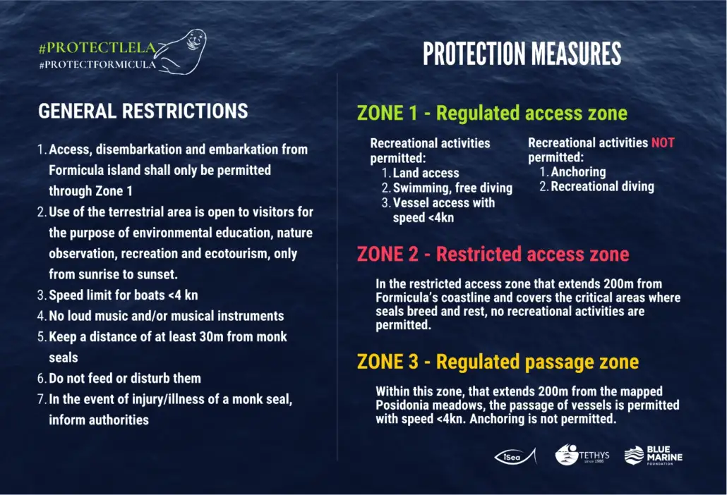 A major step for the protection of the area was the establishment of a 200-meter strict protection zone, following the Ministerial Decision 123711/3066 (Official Government Gazette 953/31.12.2024). The framework includes regulated and restricted access zones, aiming to minimize disturbance and safeguard critical habitats. Formicula is also part of the Natura 2000 Network (GR2220003) and has been identified as an Important Marine Mammal Area (IMMA), underlining its ecological importance.