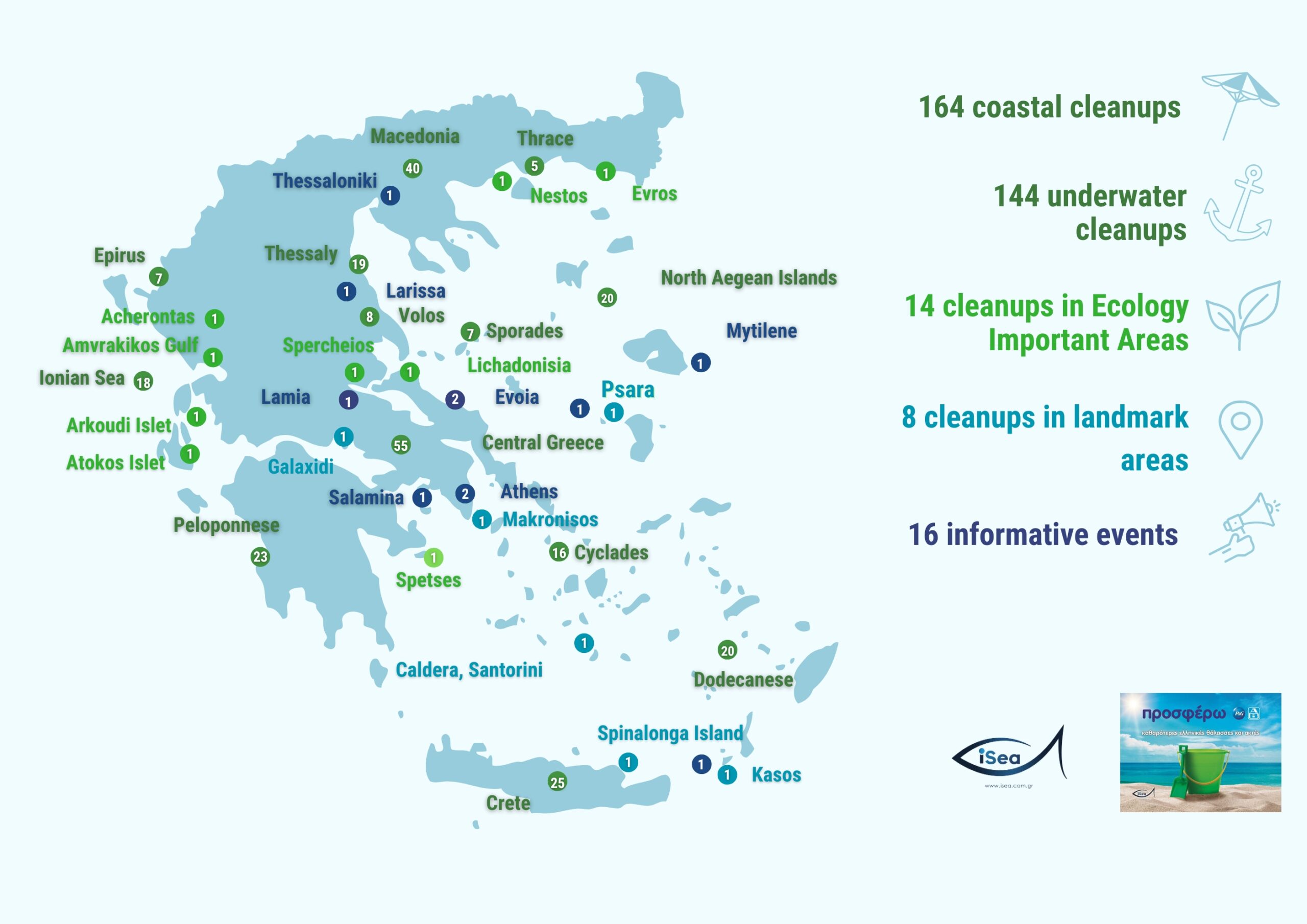 In 2024, and so far, 14 beach cleanups and 7 underwater cleanups have been implemented in North and Central Euboea, Attica, Kasos, Makronisos, Atokos islet, Nestos and Chalkidiki. Specifically, 783 volunteers participated in the cleanups and 962 kg of marine litter have been removed.