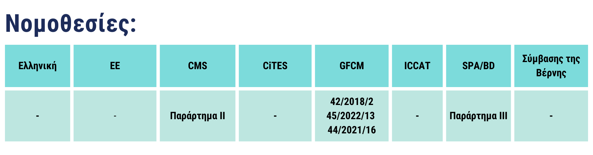 Κύριες Απειλές: Παρεμπίπτουσα αλιεία σε μηχανότρατες, βενθικά παραγάδια και απλάδια. Το είδος είναι εμπορικό και καθώς συναθροίζεται για να αναπαραχθεί είναι εφικτή η στόχευσή του παρότι οι τοπικοί πληθυσμοί μπορεί να έχουν καταρρεύσει.