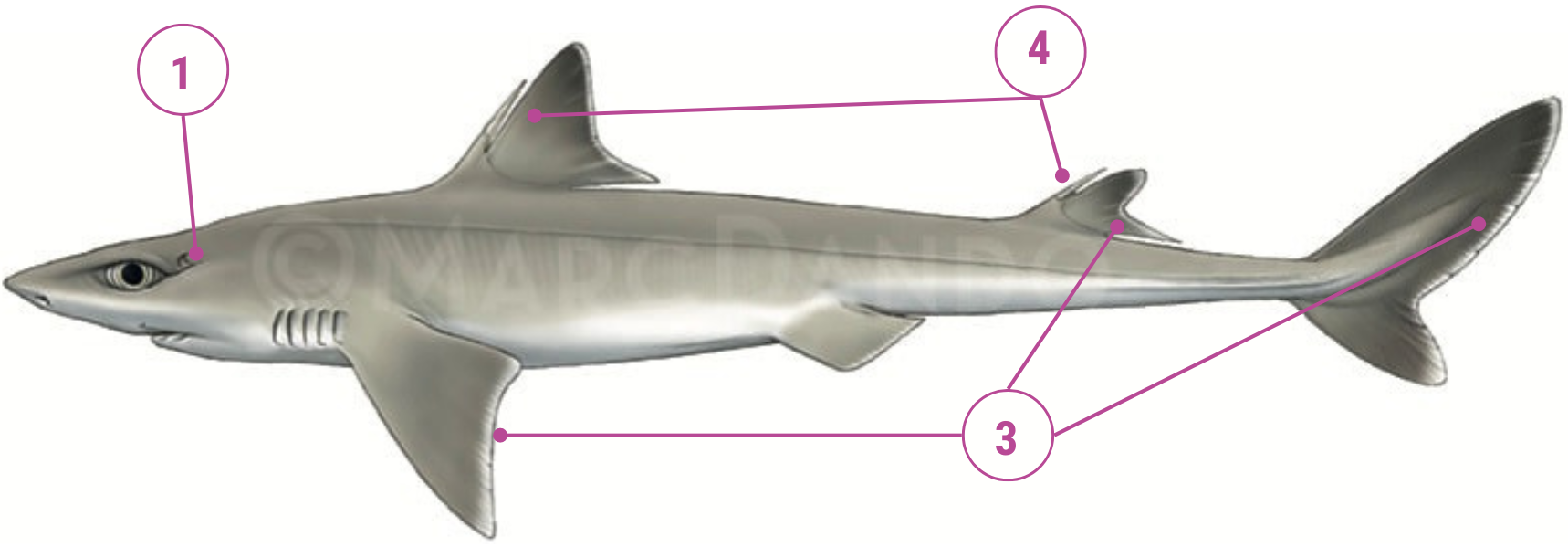 2. Άκανθες στις βάσεις των ραχιαίων πτερυγίων, με την πρώτη άκανθα μικρότερη από το ύψος του ραχιαίου πτερυγίου