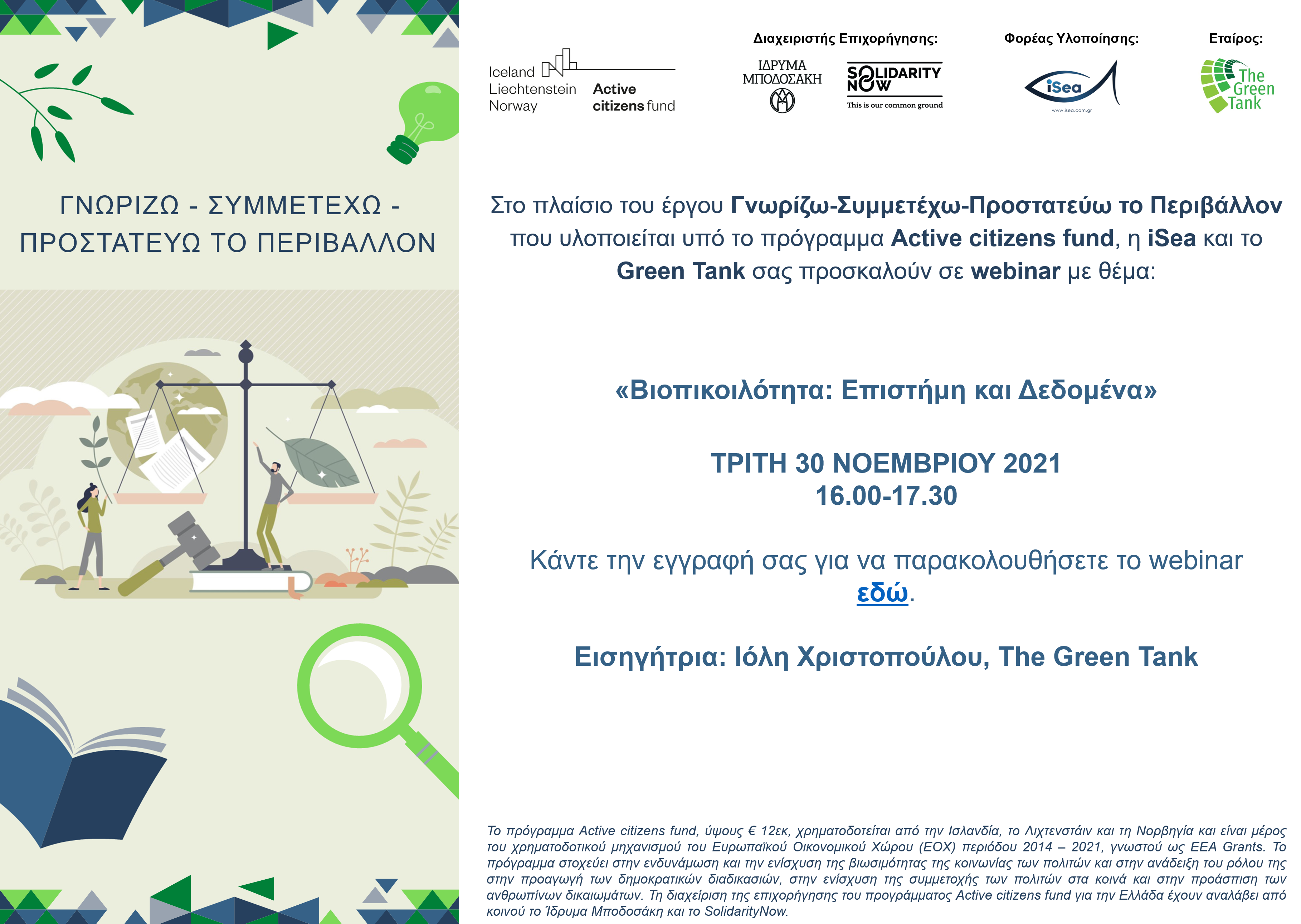 As part of the “Know-Participate-Protect the Environment” project, iSea and The Green Tank invite you to a webinar on “Biodiversity: Science and Data” aimed at informing participants about the latest data regarding biodiversity loss.