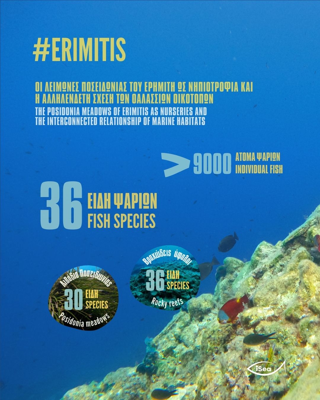 Through scuba diving surveys across Erimitis marine area, researchers recorded at least 36 fish species inhabiting Posidonia meadows and rocky reefs. The results confirmed the role of Posidonia meadows as critical nursery habitats for numerous species and the functional connectivity with the rocky reefs as fish grow and shift their ecological needs suggesting that the area’s conservation and management should not be focused on individual species or habitats, but on the overall marine environment as a connected, living system!